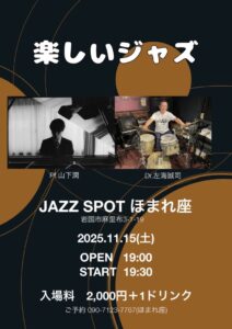 日時 2025年11月15日(土曜日) 開場19:00 開演19:30入場料 2,000円+ドリンク代(一杯)場所 JAZZ SPOT ほまれ座岩国市麻里布3-1-19 ご予約の際は下記のメールフォーム、お電話などで […]